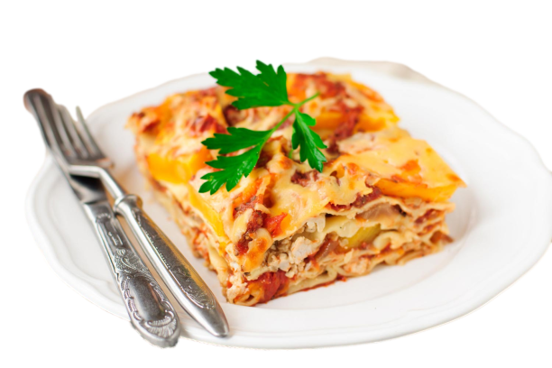 Carne bolognesa, con pollo en salsa bechamel, 4 capas de pasta y queso.