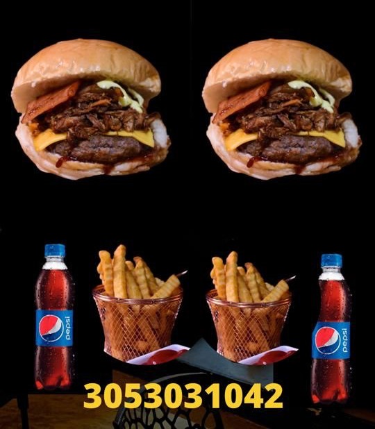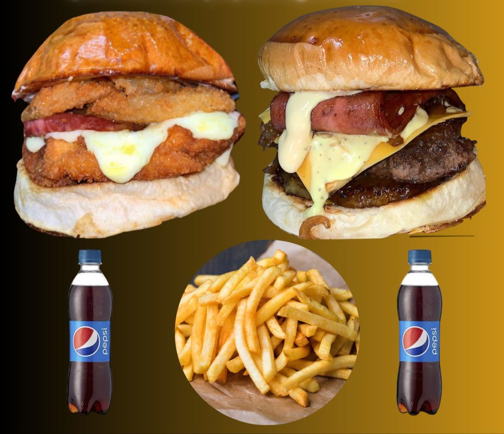 1 hamburguesa inquieta 1 hamburguesa timida, 1 porción de papas a la francesa agrandada 2 gaseosas postobon 250 ML