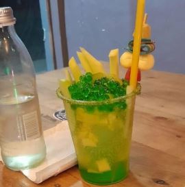 Manzana verde, mango biche, kiwi, perlas explosivas, limón en rodajas, gomitas y borde escarchado