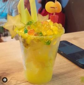 Mango biche, piña, maracuyá, perlas explosivas, torombolo, gomitas y borde escarchado